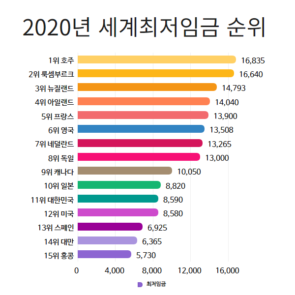 위 그래프는 2020년 기준 세계 최저시급 순위이고, 우리나라는 최저시급 8590원으로 11위권입니다. 우리나라 GDP 순위에 의하면 한국은 15위권을 유지하고 있으니, 그 전후로 비슷한거 같습니다.